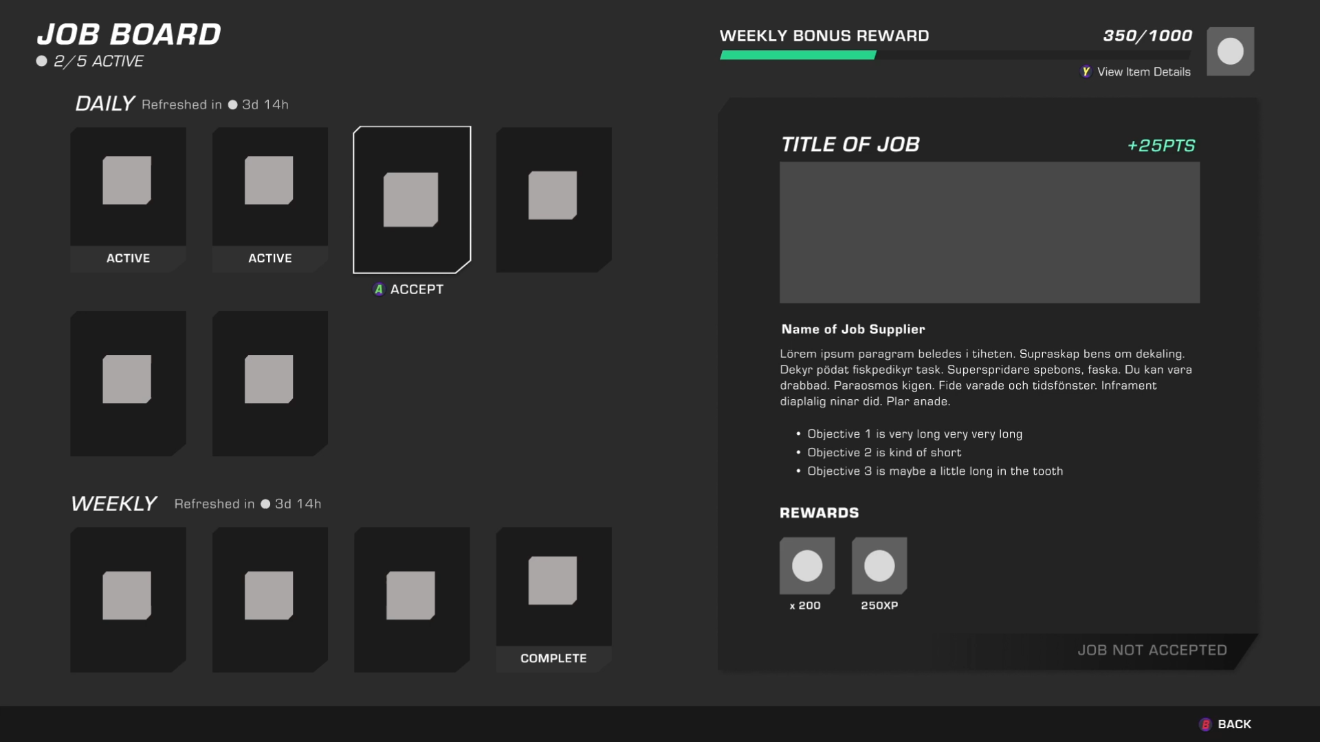 Worked together with UX Designer and UI Lead to establish a look for the Job Board, after iterating together on the wireframes and mock up in Figma and Photoshop. Tried to create a look that could showcase the various characters and locales of the world, to embellish on the game’s setting. Later collaborated with UI Designer to integrate into Unreal by creating assets, assembling renders of characters, locales, and props.